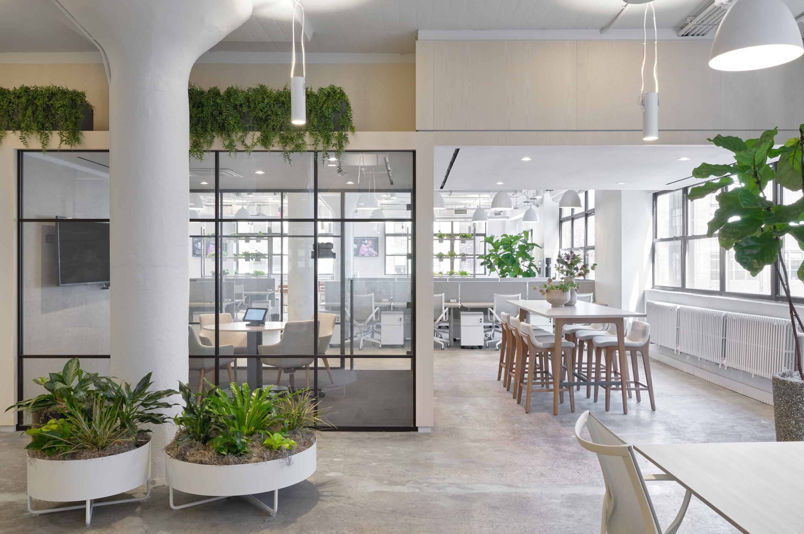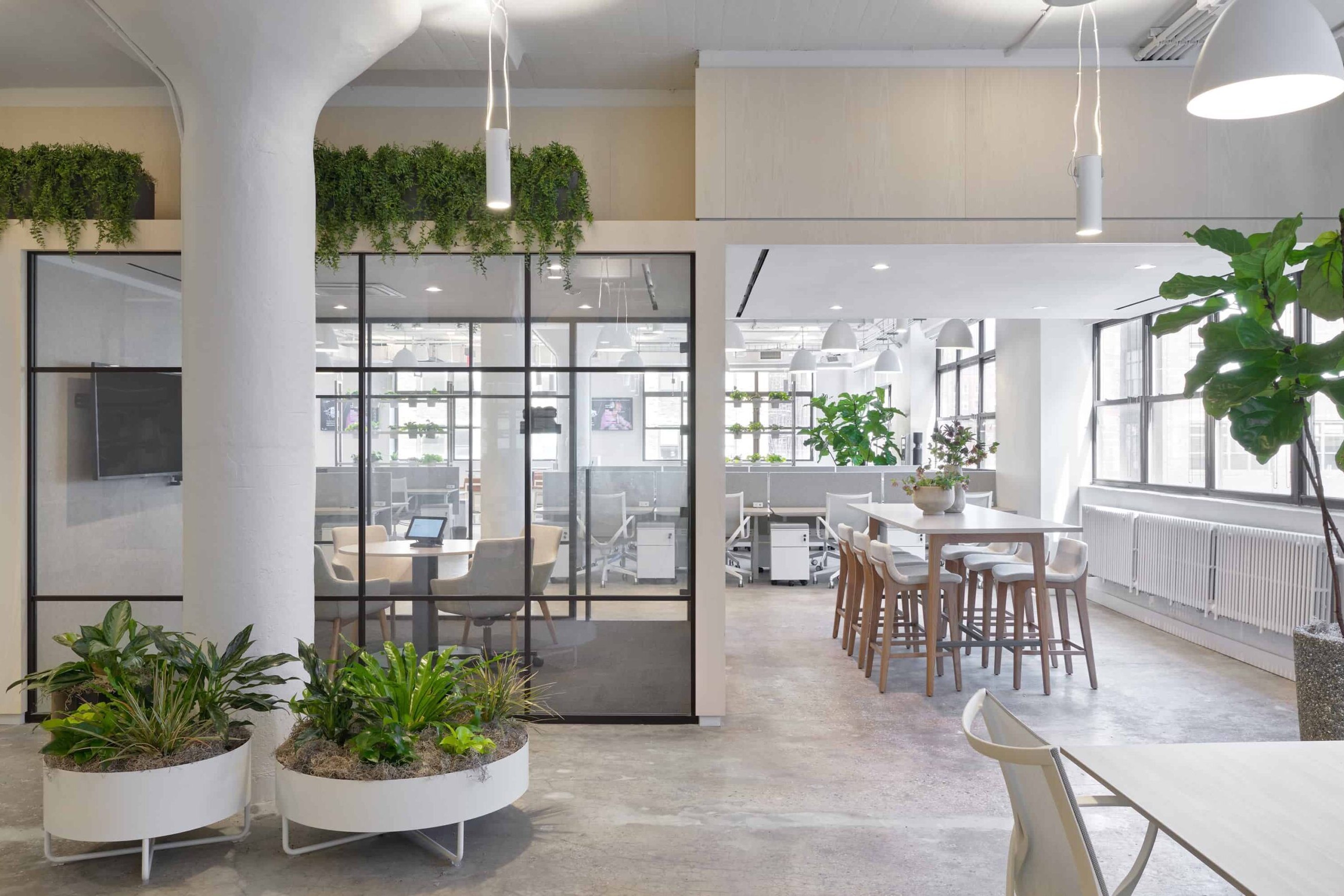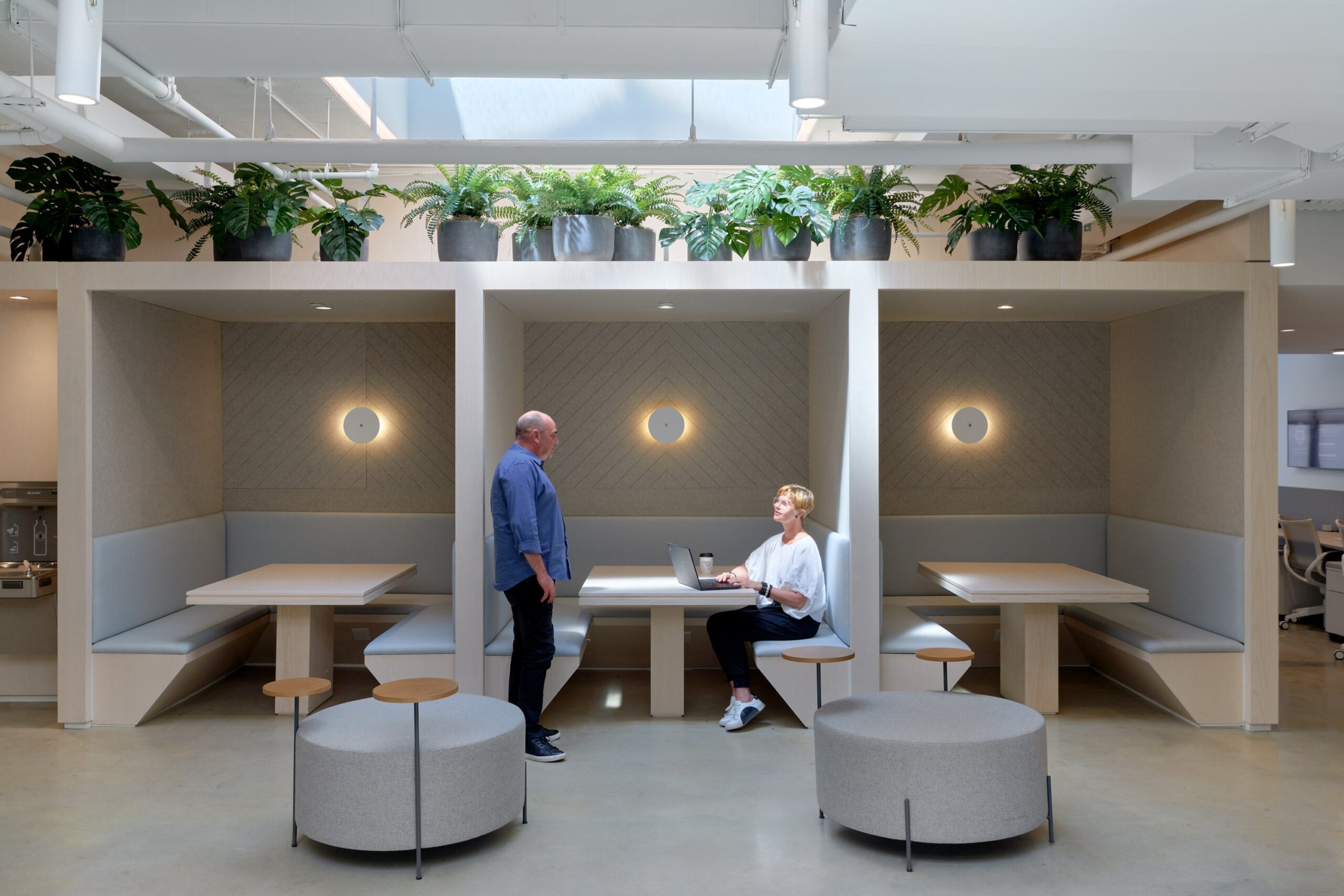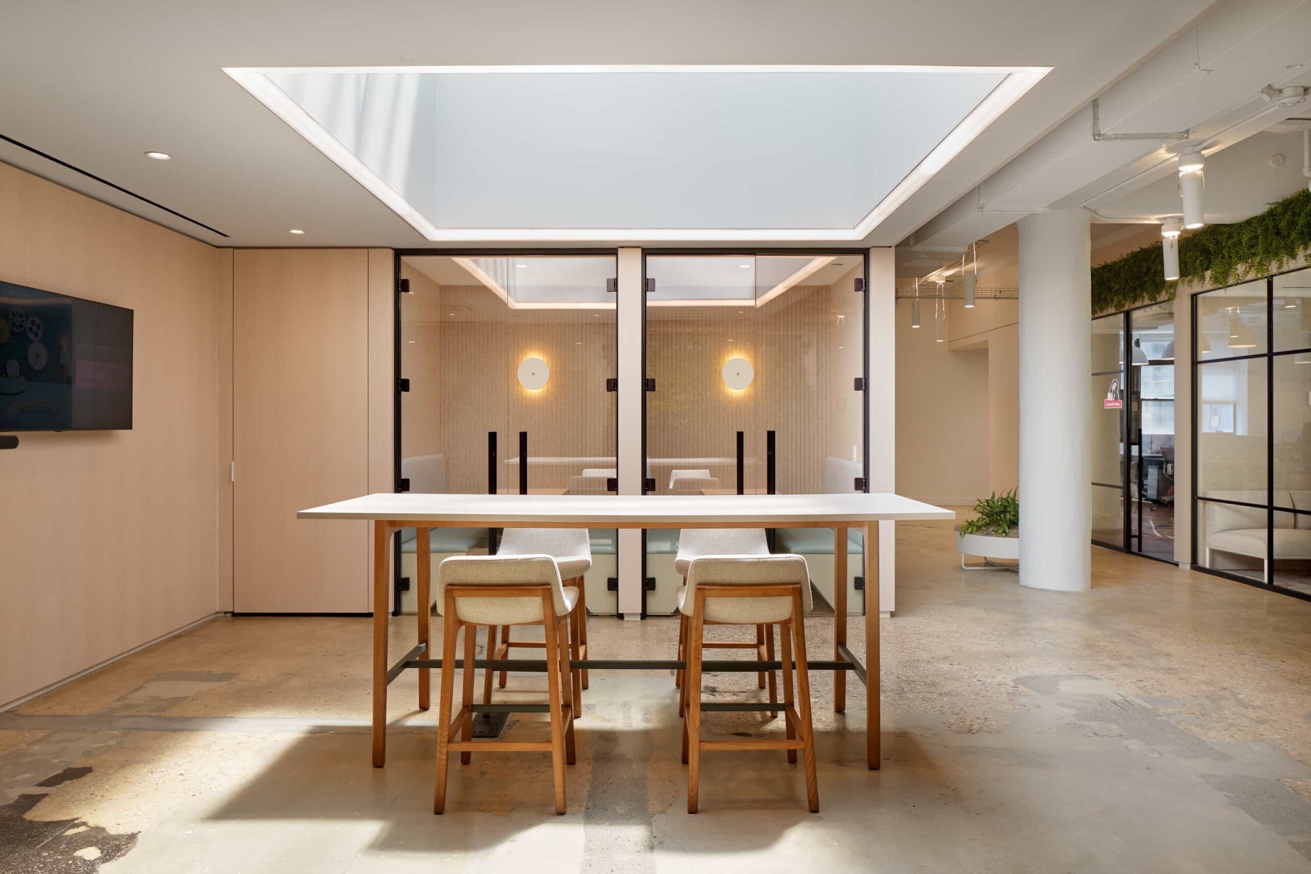 When Rokt’s team described their ideal space, there was an overwhelming desire for greenery and a focus on natural light, so we made sure to highlight those elements. The space itself is designed in a way that satisfies the request for an open feel but without being entirely open office. There are open areas, however, they are dissected by wood paneled meeting rooms, mixed use nooks, and phone rooms. These neighborhoods help to designate teams while also maintaining a feeling of connectivity with adjacent tertiary areas.