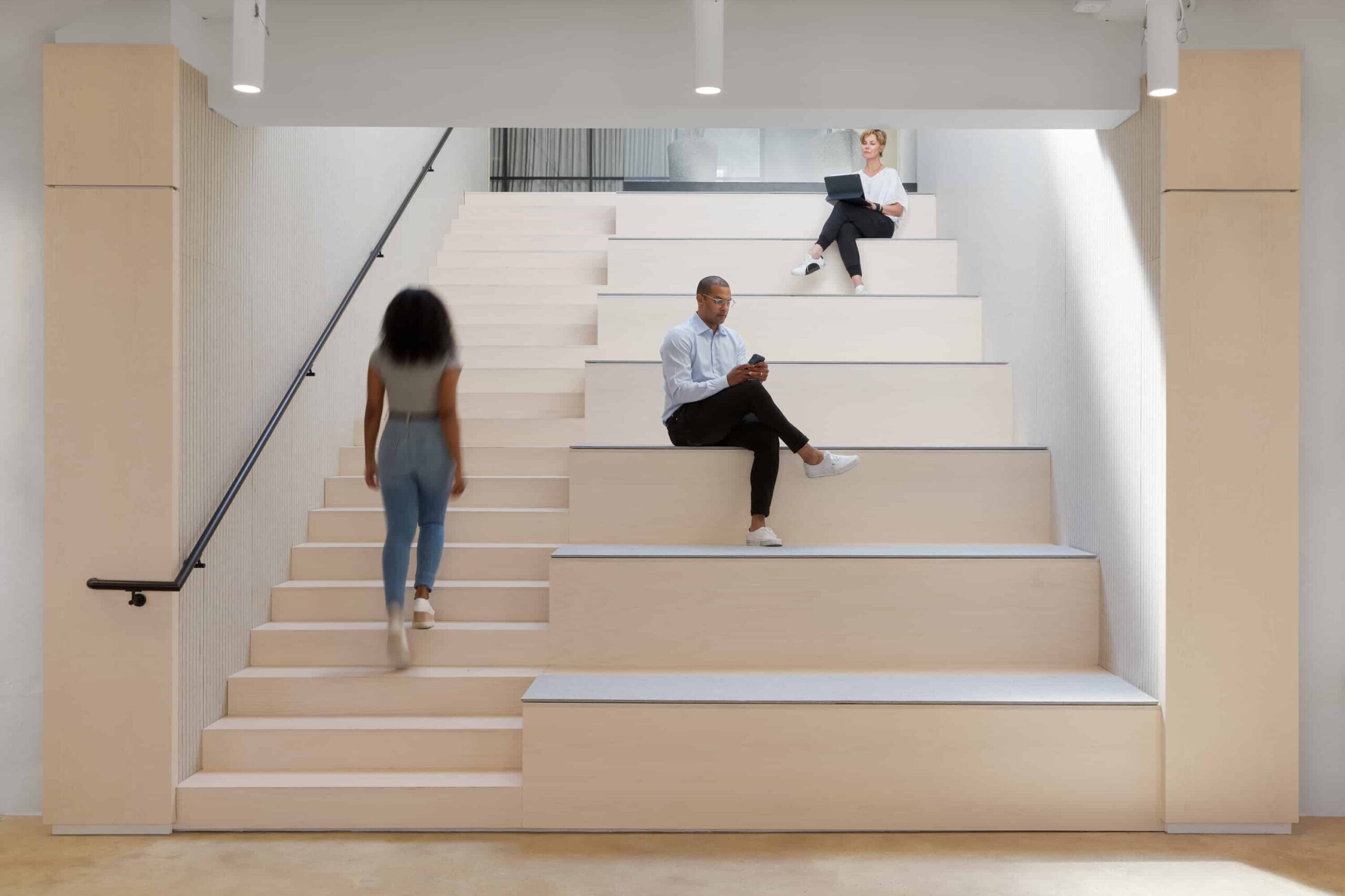 One of the standout moments that connects the two floors is the stadium seating, clad with patterned acoustic tiles which is striking in it’s height and minimalist aesthetic. This area leads to the heartbeat of the office, the main kitchen. This kitchen includes their main café, event space, and lounge areas – it’s a perfect space for presentations and happy hour.